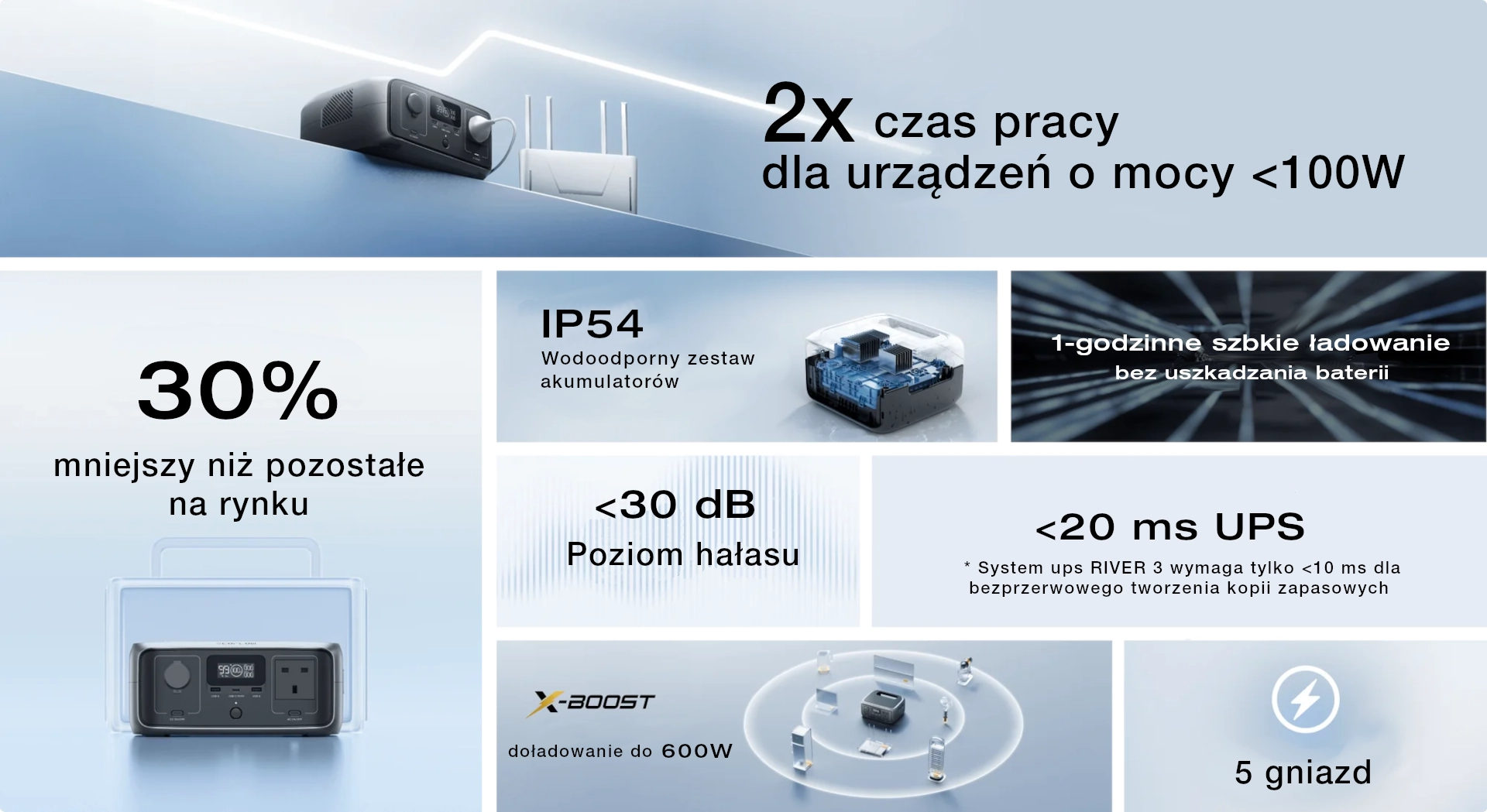 RIVER 3 zapewnia płynne działanie 90% niezbędnych urządzeń dzięki mocy 300 W. Dzięki technologii X-Boost może zasilać urządzenia grzewcze o mocy 600 W bez wysiłku.