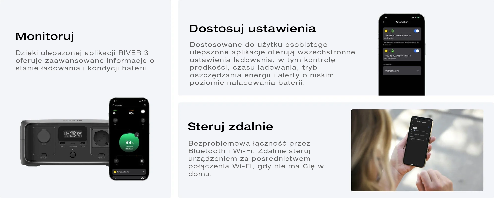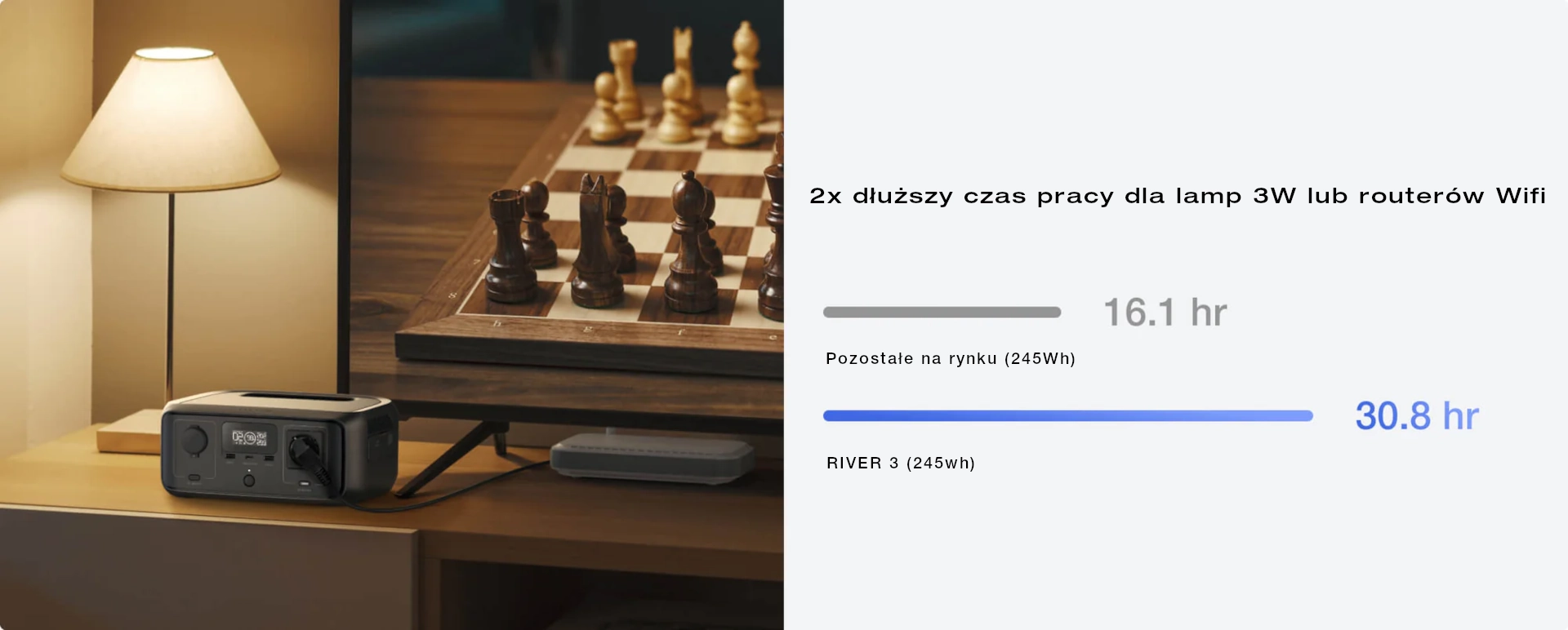 RIVER 3 rewolucjonizuje wydajność energetyczną, zapewniając podwójny czas działania urządzeń o mocy poniżej 100 W, wydłużając czas użytkowania w domu i na zewnątrz.