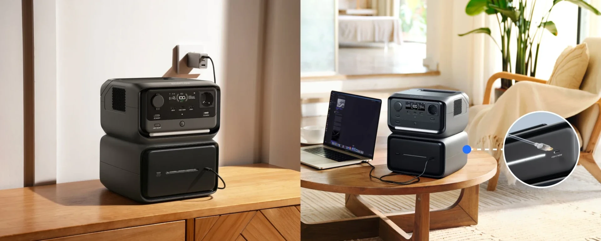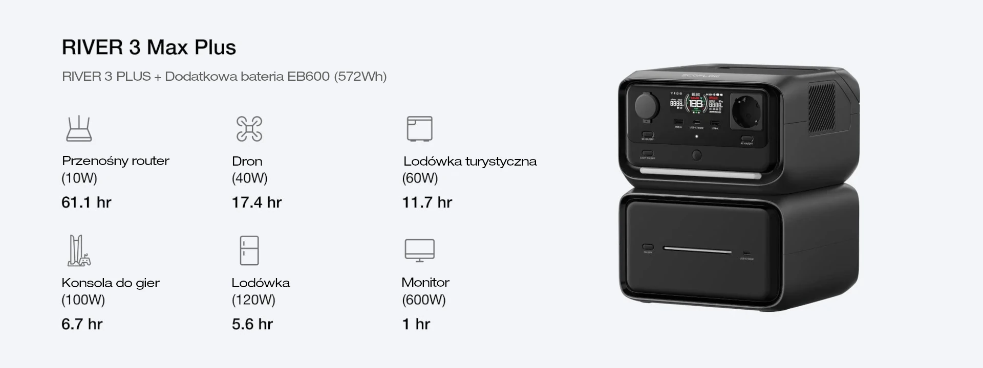Zwiększ swoją moc dzięki RIVER 3 Plus i dodatkowej baterii. Obsługując EB300 (286 Wh) lub EB600 (572 Wh), wystarczy ustawić je jeden na drugim, aby uzyskać do 858 Wh czystej energii.